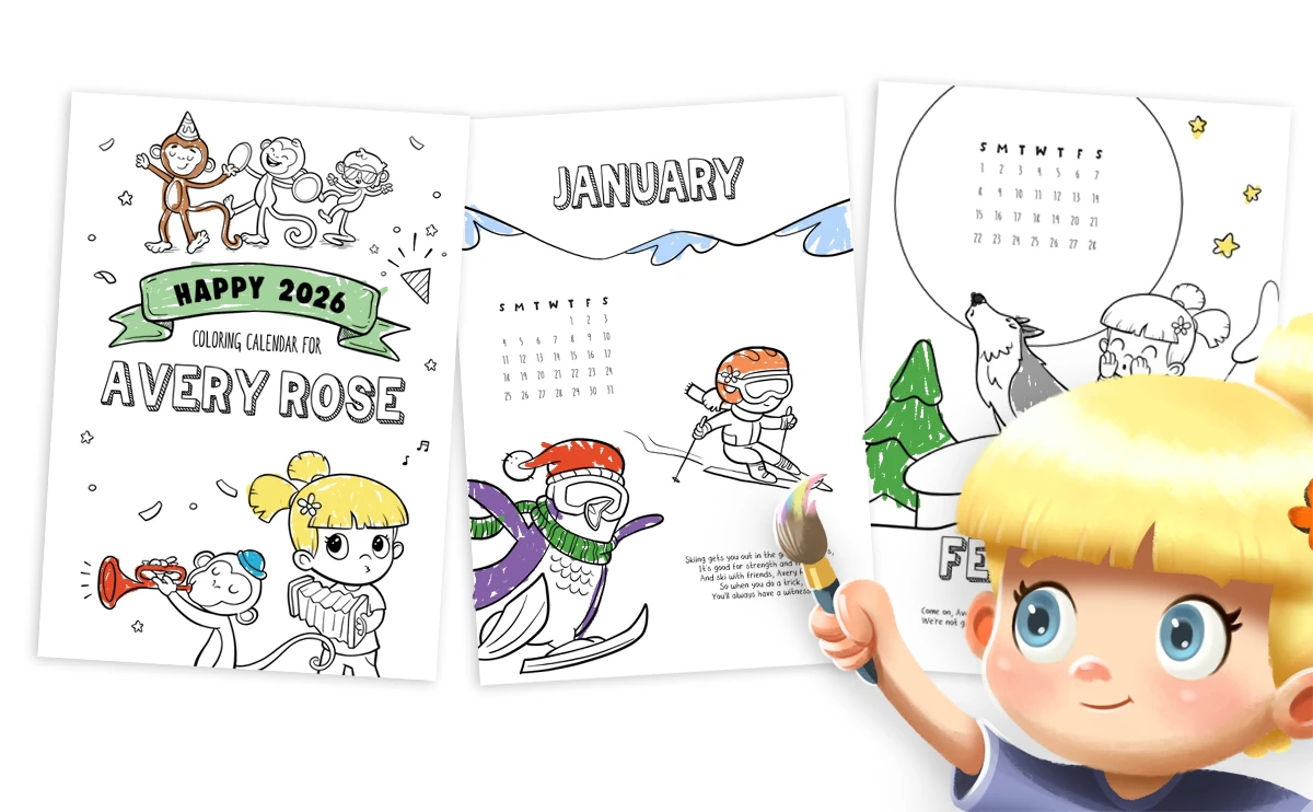 Your little one will enjoy hours of fun colouring our personalized 2026 colouring calendar!